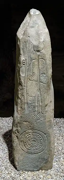 The carved surface of the stele features a schematic human figure depicting a male warrior or chieftain (wearing a helmet with oversized horns), an edged weapon, a spear and an object tentatively identified as a handheld mirror.[2] The objects are pointing down, underpinning the funerary nature of the artifact.[2] Below the rest of elements there is a carved round shield.[4]