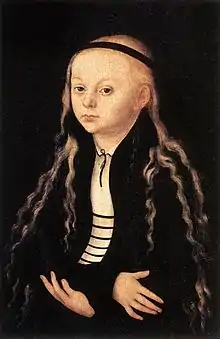 Magdalena was born in Wittenberg[1] as the couple's third child and second but first surviving daughter, as her older sister, Elisabeth, had died the year before Magdalena was born, at the age of seven months. Luther reported to Nicholas von Amsdorf that Katharina had gone into labour and after three hours, had been delivered, without any difficulties, of a perfectly healthy baby daughter.[2] She was a much loved child and she was nicknamed Lenchen[2] inside her family. Luther also asked Amsdorf to be godfather to "the said little heathen and to help her [enter] holy Christendom through the holy, precious sacrament of baptism.[2] During the Diet of Augsburg, in 1530, Luther received a portrait of the one-year-old Magdalena from his wife and thanked her by offering suggestions for weaning that he had received from Argula von Grumbach, one of the few women whose writing in favour of the Protestant Reformation are extant.[2]
