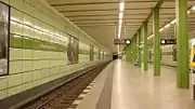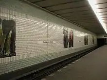 The walls are covered with green panels and the columns are also painted green. The 20 artworks of the East German artists Wolfgang Frankenstein und Hartmut Hornung from 1986 are displayed on the walls. They are painted in a very abstract way and show the history of the German workers' movement. In 1995 these paintings were to have been covered by advertisements, but this was prevented by the culture department of the Berliner Senat.[1]