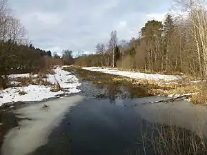 Magelungsdiket had a drainage area of 17 km² stretching north to Mälarhöjden until the south-western suburbs of Stockholm were built in the early 1950s and water was guided to Lake Mälaren through stormwater pipes. Today only 1,5 km² remains of the drainage area and most of the contributions comes from one-family houses in eastern Rågsved and green areas around Magelungen. Water flow is slow, often stagnant, and the ditch is surrounded by dense vegetation. It opened out in a wetland drained in 1994 in order to create canals and minor islands attracting birds. Very high levels of metals have been reported from a street inlet near the outlet.[1] Together with Kräpplingadiket, it is estimated to contribute some 100 kg/year of phosphorus. The ditch is one of a few locales for Grass Snake in Stockholm.[2]