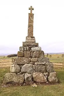The memorial monument can be found less than a mile outside of Dunning, a village in Perthshire in Scotland.[2] It can be accessed from B8062 from the A9.[1] The monument stands 20ft (~6 metres) high, it is made of stones and resembles a cairn.[1] It has a stone cross on the top of it and bears the painted inscription "Maggie Wall burnt here 1657 as a witch".[1][2]