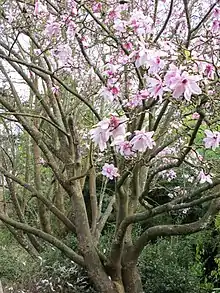 It is a small, ornamental deciduous tree that can grow to heights of 20 m. Leaf shape is obovate to elliptic-obovate, 7.5–14 cm-long, and is bright green above and glaucous underneath. The white to reddish flowers are large (16–25 cm wide), fragrant, and appear before leaves.[3] It was first discovered in western Sichuan in 1869 by Père Jean Pierre Armand and was introduced in western cultivation in 1908, when E.H. Wilson sent seeds from plants growing near Kangding, Sichuan, to Arnold Arboretum in Jamaica Plain, Massachusetts. They are, however, rarely cultivated.