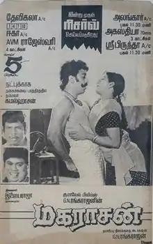 Maharasan is a 1993 Indian Tamil-language comedy film produced, directed and co-written by G. N. Rangarajan. The film stars Kamal Haasan and Bhanupriya, while Ramesh Aravind, Chandrasekhar, Goundamani, Senthil, Vadivelu, V. K. Ramasamy, Raghavi and Vadivukkarasi play supporting roles. It was released on 5 March 1993. Kamal Haasan played an extended cameo in the movie without any payment, in order to help his friend G.N. Rangarajan come out of his financial crisis.[1] The movie ran successfully in theatres, thereby becoming a profitable venture and helped the producer-director recover from his earlier debts.