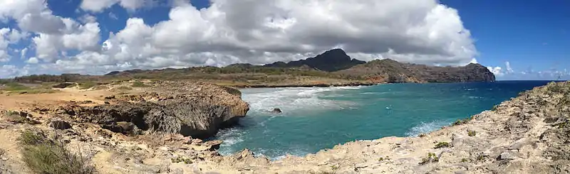 Māhāʻulepū Beach is a beach on the southeast coast of the Hawaiian island of Kauai. It is two miles (3.2 km) long and goes from Punahoa point to Paʻoʻo point.[1] The beach is separated into three different parts: Gillin's Beach, Kawailoa Bay, and Hāʻula Beach.[2] Gillin's Beach, the center section, is known for petroglyphs that are carved into the rocks, though they are rarely exposed.[1] Fossils of extinct birds have been found in sand dunes along the shoreline, including the Kauaʻi Stilt-owl (Grallistrix auceps), a flightless rail, and three species of goose. Close to the beach is the paleontologically important Makauwahi Cave.[3]
