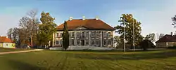 Maidla manor (German: Herrenhaus Wrangelstein) traces its history back to at least 1465, although the village is mentioned for the first time as early as the 13th century, in the Danish Census Book. The manor estate has over the centuries belonged to several different aristocratic families. The present baroque manor house was built in 1764-1767 according to plans by architect J. P. Dürschmidt, during the ownership of the Wrangel family. After the Estonian land reform that followed the declaration of independence of Estonia in 1919, the manor was converted into a school. The manor is a fine example of baroque manor house architecture in Estonia. Details such as the finely carved door, interior stucco decoration and the pediment decorated with coats-of-arms, survive.[2][3]