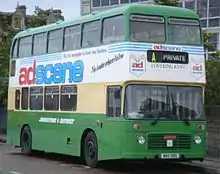 Maidstone & District became part of the National Bus Company (NBC) on 1 January 1969. The company purchased several batches of Leyland Leopards for both bus and coach work. An unusual order was for a fleet of 30 two-door Marshall single deck vehicles based on Daimler Fleetline 33 ft. chassis for one person operation in the Medway Towns. In 1972 these were exchanged with similar age double deckers Fleetlines from Northern General Transport. NBC introduced standard liveries in 1972 and the traditional dark green and cream livery gave way to NBC leaf green.