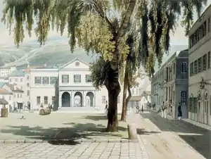 In the mid-18th century, John Mackintosh Square was used as a parade ground known as the Parade. The building is shown in a plan drawn in 1750, but published in 1770, and referred to as the Main Guard Room. On a 1753 plan of the Parade, it was labelled as the Main Guard. Its location near the King's Bastion meant that it sustained extensive damage during the Great Siege of Gibraltar (1779–1783).[3][9] The second storey present today was likely added when the guardhouse was rebuilt. In an 1830s image of Commercial Square, another previous name for John Mackintosh Square, the building is shown with two storeys.[3] The 1830s painting (pictured above) by British artist Thomas Colman Dibdin (1810 – 1893) shows the Main Guard with officers stationed outside, as well as the nearby Exchange and Commercial Library on the eastern side of the square.[10][11] Every evening, the sentries in Gibraltar would receive their assignments at the Main Guard.[8] Early 19th-century regulations in Gibraltar required that any inhabitant wandering in the streets after midnight without a permit was to be transferred to the Main Guard. In addition, any inebriated soldier in the city was to be sent to that same guardhouse.[12]