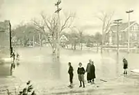 In 1929, a new centralized post office was built to the east of the present 1932-dedicated Anderson-Mayberry American Legion Hall (named for servicemen Edgar Anderson and Edwin Mayberry, who died from the Spanish flu while based at Fort Devens).[1] On the left side of this building was the Fidelity Trust Company. The bank failed early in the Great Depression of the 1930s.[27] To the east of the post office stood the Knights of Pythias Hall.[27] It became the Pastime Theatre in the 1920s, then Yarmouth Theatre between 1942 and 1956. Harriman's IGA Foodliner moved here in the late 20th century from its Main and West Elm Streets location. A KeyBank (formerly Casco Bank) and the parking lot for NYA's Priscilla Savage Middle School now stand in its place.