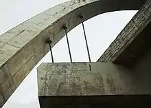 The bridge is a post-tension box girder structure with the center pier as an arch support straddling the road.[2] Used in lieu of a center support, the arch is 110 feet (34 m) wide[2] and 75 feet (23 m) tall.[3] Six cables measuring four inches (102 mm) in diameter run from the arch to the main structure of the bridge at the center.[3] The two ends of the reinforced concrete arch are connected to each other underground using a post-tension tie beam, making the structure a tied arch.[2]