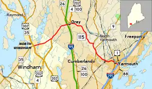 State Route 115 (SR 115) is a state highway in southern Maine, United States. It runs west to east for just over 18 miles (29 km), from U.S. Route 302 (US 302) and SR 35 in North Windham to SR 88 in Yarmouth.
