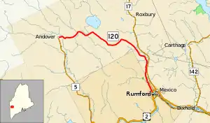 State Route 120 (SR 120) is a state route in the U.S. state of Maine that runs from SR 5 in Andover to the U.S. Route 2 (US 2) and Lincoln Avenue intersection in Rumford. SR 120 runs through the towns of Roxbury and Mexico as well.