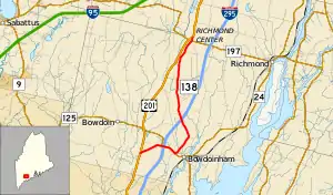 State Route 138 (SR 138) is part of Maine's system of numbered state highways, located entirely in Sagadahoc County. It runs from U.S. Route 201 (US 201) in Bowdoin, to Interstate 295 (I-295) while running concurrent with SR 125 for one mile (1.6 km). It then reaches SR 197 in Richmond, and ends at the junction with US 201 in Richmond.