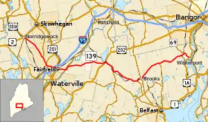 SR 139 begins at an intersection with U.S. Route 201A, U.S. Route 2, and SR 8 in Norridgewock. The intersection of SR 139 and U.S. Route 2 is notorious for being one of the most dangerous intersections in central Maine. SR 139 then heads south and joins SR 104 for a 2.78 mile concurrency, during which it intersects with SR 23, followed by an interchange with Interstate 95. The section of SR 139 between U.S. Route 2 in Norridgewock and Interstate 95 in Fairfield is often used as a bypass of U.S Route 2 through Skowhegan. From the interchange with Interstate 95, as it heads east there is a 0.22 concurrency with U.S. Route 201 in Fairfield and then a 2.23 mile concurrency with SR 11 and SR 100 in Benton. SR 139 continues on to have a 0.18 mile concurrency with U.S. Route 202 and SR 9 before once more being without concurrent routes for 0.69 miles in Unity and then begins a 3.5 mile concurrency with SR 220 in Thorndike. SR 139 intersects SR 203 at its northern terminus and then SR 7 as it continues through Brooks. It then continues into Monroe, where it intersects SR 141 at SR 141's northern terminus. From there, SR 139 has a 1.67 mile concurrency with SR 69 and reaches its western terminus at US Route 1A in Winterport.[2]
