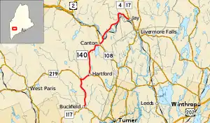 State Route 140 (SR 140) is part of Maine's system of numbered state highways, located in Oxford and Franklin counties. The southern terminus of the route is in Buckfield, at the intersection with SR 117. The northern terminus of the route is in Jay, at the intersections with SR 4 and SR 17. SR 140 is 22.3 miles (35.9 km) long.
