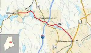 State Route 157 (SR 157) is a 22-mile-long (35 km) state highway in the northern part of the U.S. state of Maine. It travels between the towns of Millinocket and Mattawamkeag generally following the northern banks of the West Branch Penobscot River and the Penobscot River. For just under a half of its length, it is concurrent with SR 11 from Millinocket to Medway. This portion is also concurrent with the Katahdin Woods & Waters Maine Scenic Byway.