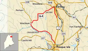 State Route 164 (SR 164) is part of Maine's system of numbered state highways. It runs 23.6 miles (38.0 km) from Presque Isle to Caribou. It begins at an intersection with U.S. Route 1 (US 1) just north of downtown Presque Isle and travels northwest along the Aroostook River to Crouseville and Washburn. In Washburn, it intersects SR 228. From there, it heads northeast to downtown Caribou. In Caribou, it splits into a one-way pair and also forms a concurrency with SR 161B. The southbound direction of travel through Caribou (physically traveling mostly west) intersects SR 89 at its western terminus. After traveling through the center of the city, the road heads south along Main Street to end at US 1 south of the city center.[2]