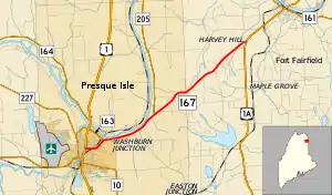 State Route 167 (SR 167) is part of Maine's system of numbered state highways. It runs 8+1⁄2 miles (13.7 km) from an intersection with U.S. Route 1 (US 1A) in Presque Isle to a junction with US 1A in Fort Fairfield.[2]