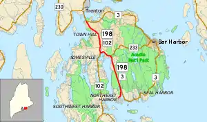 SR 198 begins in the village of Northeast Harbor. It heads northward and has a concurrency with SR 3 from Northeast Harbor and intersects SR 233. Near Somesville, SR 3 ends but SR 198 turns north along the route of SR 102. SR 198 and SR 102 run together for four miles (6.4 km) and enter Bar Harbor. Both routes have their northern end at SR 3.[2]