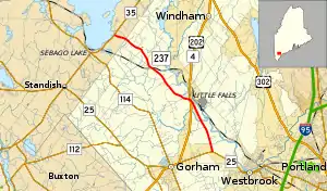 State Route 237 (SR 237) is a state highway located in Cumberland County in southern Maine, United States. It begins at SR 25 in Gorham and runs for 8.13 miles (13.08 km) north to Standish, where it ends at SR 35. The highway functions as a bypass of the towns of Gorham, Windham and Standish.