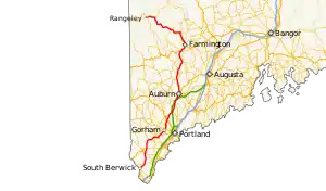 As first designated in 1931, SR 4 extended from its present terminus at the New Hampshire state line to the Coburn Gove-Woburn Border Crossing, running the entire length of western Maine. It was designated on a new routing between South Berwick and North Berwick. From North Berwick, it replaced former SR 214 which extended into downtown Sanford at SR 109, then was cosigned with SR 11 (which, at the time, still ran east to Biddeford) to Alfred at SR 4A (which, at the time, bypassed Sanford to the east). From there, it displaced former SR 111 which ran as far as the SR 25 junction in Gorham. A new routing was used from Gorham to Gray, then SR 4 was cosigned with existing SR 115 and SR 100 into Auburn. From Auburn, SR 4 replaced SR 107 which extended to Rangeley as SR 4 does today, except for the short extension to Haines Landing which SR 4 did not initially occupy.[2] This short section of road became part of SR 16 in 1933, then was designated as a second iteration of SR 144 in 1936.[3] From the town center of Rangeley, SR 4 replaced former SR 144 (modern SR 16, not related to the "new" SR 144 in Rangeley) which ran northeast to Eustis, and a new routing along local roads (modern SR 27) to the Quebec border crossing.[2] When SR 16 was designated in 1933-34, it was cosigned with SR 4 from Rangeley to Eustis, meeting the northern end of the newly designated SR 27 in Eustis.[4][5]
