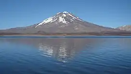 Maipo is a stratovolcano in the Andes, lying on the border between Argentina and Chile. It is located 90 km (56 mi) south of Tupungato and about 100 km (62 mi) southeast of Santiago. It has a symmetrical, conical volcanic shape, and is among the southernmost 5,000 metre peaks in the Andes.[3]