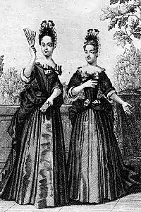 so that nothing in this spectacle might be disagreeable to this Prince, she had Persian clothes made for all the Demoiselles who were to appear on the stage : they were very brilliant, ornamented with pearls and diamonds from the Temple, which had previously been used in the ballets.[13]