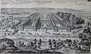 The domaine of Saint-Cyr was assigned to the Maison in 1685, and the king ordered[1] major building work on the domaine next to Versailles, led by Jules Hardouin Mansart.[4] The project cost the king 1,400,000 livres.[4] Hardouin-Mansart's designs for the Maison used the U-shaped plan he often used elsewhere, with the buildings reserved for the mistresses and students forming an H, to which the school chapel had to be added to the west. The classrooms and students' dormitories were on the first and second floors respectively, the dormitories just above the classrooms for the corresponding classes. Each dormitory held 40 beds and was surrounded by two cells for the mistresses. Each classroom was also juxtaposed with a small supplementary dormitory with 20 beds, itself next to two cells for the mistresses. The infirmary was sited away from the dormitories to allow the sick to be isolated and thus avoid the spread of contagious diseases.[1] The rooms reserved for pensionnaires were situated to the east of the buildings, to put them as far as possible from the visitor entrance, situated to the west at the level of the external courtyard.