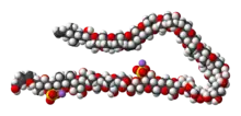 The molecule itself is a system of 32 fused rings. It resembles large fatty acid chains and it is notable because it is one of the largest and most complex non-protein, non-polysaccharide molecules produced by any organism. Maitotoxin includes 32 ether rings, 22 methyl groups, 28 hydroxyl groups, and 2 sulfuric acid esters and has an amphipathic structure.[7][8][9] Its structure was established through analysis using nuclear magnetic resonance at Tohoku University, Harvard University and the University of Tokyo in combination with mass spectrometry, and synthetic chemical methods. However, Andrew Gallimore and Jonathan Spencer have questioned the structure of maitotoxin at a single ring-junction (the J–K junction), based purely on biosynthetic considerations and their general model for marine polyether biogenesis.[10] K. C. Nicolaou and Michael Frederick argue that despite this biosynthetic argument, the originally proposed structure could still be correct. [11] The controversy has yet to be resolved.