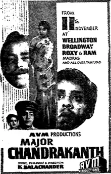 Major Chandrakanth is a 1966 Indian Tamil-language drama film produced by A. V. Meiyappan and directed by K. Balachander. Based on his play of the same name, the film stars Major Sundarrajan, Nagesh, R. Muthuraman, A. V. M. Rajan and Jayalalithaa. It revolves around a retired and blind major who gives asylum to a fugitive wanted for committing murder, unaware that the victim was his younger son.