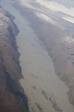 Majorqaq is approximately 71 km (44 mi) long. The river source at 65°41′30″N 50°32′00″W is an outflow glacier draining the Greenland ice sheet, in the far inland region of the country.[1] Majorqaq retains approximately the same width for the entire length of the river flow, from its source to its large delta,[1] carrying large quantities of glacial silt. The river flow is variable, with large patches of quicksands across its entire length, particularly near the delta. The river empties into Isortoq Fjord at 65°35′30″N 51°54′00″W.[1]