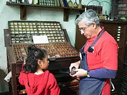 Demonstrating the use of a composing stick in front of divided upper and lower type cases at the International Printing Museum in Carson, California, United States, North America