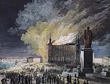 On 24 November 1825, a fire broke out during a performance. When smoke was smelled, actor Lars Hjortsberg, speaking from the stage, informed the audience of this and asked them to leave the building. All spectators were safely evacuated, though three employees died in the fire. The building suffered severe damage and was subsequently torn down. A number of stone sculptures were saved, some of which were incorporated into private mansions, while others ended up in various museums, such as the Nordic Museum. A number of artifacts are exhibited at the Stockholm metro's Kungsträdgården station, close to the former location of Makalös.