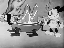 Though naked, the terrier takes the boot, and tosses it off an edge of Fairy Land. The terrier thinks he has the last laugh, and goes on to howl loudly. A giant Fairy Land inhabitant finds the howling bothersome, and therefore hurls a jar. The terrier finds his head stuck in the jar, prompting that canine to leave the scene for good. Oswald goes to also do some howling, thus irritating more inhabitants who hurl boots at him. Oswald then collects the boots and offers them to the creatures as replacements for the discarded one.