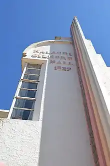 The façade is rendered concrete with a complex massing of curving and rectangular shapes presenting a stepped skyline to the street. The emphasis is generally horizontal except for a central portion with a vertical pier rising to a height of nearly 14 metres. The metal-framed windows create a grid-like pattern and are stepped in size and proportion to match the stepped façade. Glass bricks form a large curved wall. The building's name is rendered in stylized lettering on the façade.[1]