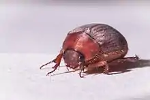 The species was originally first described from India in 1894. It was dispersed to Iran in the 1960s, while it reached Israel in the 1980s. It is believed that a number of specimens arrived on shipments of pistachios and oil that were brought from Iran. Unaware that this beetle was already well-known elsewhere, an Israeli researcher mistakenly renamed it Maladera matrida, the new scientific name reflecting the nuisance it brings: "matrida" "מטרידה" means "bothersome" in Hebrew.[1] Due to its Iranian origin and brown color ("חום khoom" in Hebrew), it is colloquially named 'Khomeini' after Iranian politician Ruhollah Khomeini, spiritual leader of Iran at the time the insect began spreading in Israel.[2] Currently this invasive species is distributed in the Arabian peninsula and northern Africa as well.