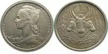 | Obverse: Portrait of Marianne with cargo ships in the background. Year at the bottom and lettering "REPUBLIQUE FRANÇAISE" on the periphery. | Reverse: Denomination on top and country name at the bottom. In the centre, three Zebu conjoined heads. |
