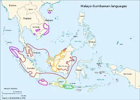 ![]() The Malayo-Sumbawan languages The languages in Cambodia, Vietnam, Hainan, and the northern tip of Sumatra are Chamic languages (purple). The Ibanic languages (orange) are found mostly inland in western Borneo, perhaps the homeland of the Malayic peoples, and across Sarawak. The Malayan languages (dark red) range from central Sumatra, across Malaya, and throughout coastal Kalimantan. Sundanese (pink), Madurese (ocher), and the Bali–Sasak languages (green) are found in and around Java. | |