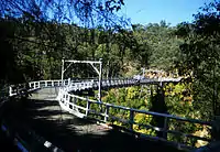 Maldon was also the site of 'Harvey's Crossing', one of two stone causeways over the Upper Nepean River on the Picton - Menangle Road. Stonework supporting the steep approach roads on each side can still be seen. The causeway was replaced by a wooden suspension bridge in 1903, designed by Ernest Macartney de Burgh.[3] By the 1970s, the bridge had become a severe bottleneck, especially with the increasing coal traffic. A deviation of the main road and a concrete beam bridge were constructed further north along the Gorge, and opened in 1980.[4] The Suspension Bridge is now a Heritage item.[5] It is closed to all traffic, including pedestrian.