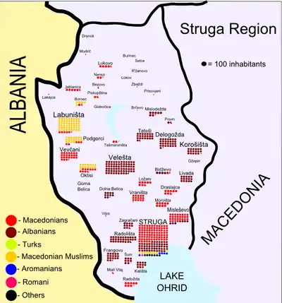 Malesia (Macedonian: Малеcија, romanized: Malesija, Albanian: Malësia; also Struga Malesia, Macedonian: Струшка Малесија, romanized: Struška Malesija, Albanian: Malësia e Strugës) is a small region in the Upper Struga Municipality, in western North Macedonia, at the Golema River. It is inhabited by Orthodox Christians, as opposed to the settlements to the south, which are Muslim. Burinec and Selce used to be part of the Debar župa. The Karaorman Mountain is situated to the east of Ržanovo. The toponym Malesija is of Albanian origin from the word Malësi meaning a mountainous area or region.[1] During the period between 1960-1975, many inhabitants of Malesia migrated to Struga. In a 1903 document by the Cartographic Society of Sofia, the villages of Malesia were all registered with Albanian Orthodox majorities, but nowadays they have assimilated and identify as Macedonians.[2]