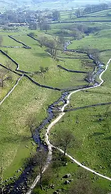 Malham Beck is a stream some 1.2 miles (2 km) long, running southwards through the valley beneath Malham Cove in the Yorkshire Dales, England. It originates in a cave beneath Malham Cove,[1] and flows through Malham before joining Gordale Beck to become the River Aire just south of the village.[2]