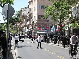 There are no indoor malls on this street;[4] rather, the avenue is lined with dozens of small shops that sell essential consumer goods such as "clothes, food, school supplies, medicine, and limited luxuries" to the Haredi community.[3] There are kosher music stores, kosher pizza shops, home appliance stores, falafel and juice stands,[7] a kosher ice cream parlor,[8] pharmacies, photo shops, a teenage novelty store, Judaica sellers,[9] kosher bakeries, and a shtiebel with continuous minyanim.[10] All food stores carry reliable hechsherim (kashrut certificates) to appeal to the Haredi clientele, which often shops with children in tow.[4] In the weeks before Sukkot, numerous stores vacate their premises and rent their space to etrog dealers,[11] while sidewalk vendors sell etrogs, lulavs, sukkah decorations and pictures of rabbinical figures.[12] As a central Haredi shopping district for both locals and tourists, Malkhei Yisrael Street is also populated by a number of street beggars, some of whom have been working the street for decades.[10]