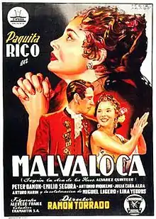Malvaloca is a 1954 Spanish drama film directed by Ramón Torrado and starring Paquita Rico, Peter Damon and Antonio Riquelme. It is an adaptation of the 1912 play of the same title about a fallen woman from Málaga who eventually redeems herself.[1]