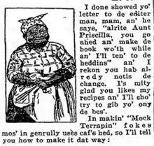 Aunt Priscilla's Recipe was a notable food and recipe column in the Baltimore Sun during the 1930s. Aunt Priscilla was a mammy caricature who was the stereotypical good southern cook who spoke in a broken and exaggerated dialect. The alias of Aunt Priscilla was actually a white woman named Eleanor Purcell. Purcell also released several cookbooks under the alias.[13] Purcell also took up the person of Aunt Ada in a column for The Evening Sun named "Ask Aunt Ada". Black women were often the faces of these food or housekeeping columns because of the stereotypes like the mammy which associated them with servant and domestic roles.[14]