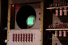 By June 1948 the Baby had been built and was working.[24] It was 17 feet (5.2 m) in length, 7 feet 4 inches (2.24 m) tall, and weighed almost 1 long ton (1.0 t). The machine contained 550 valves (vacuum tubes)—300 diodes and 250 pentodes—and had a power consumption of 3500 watts.[31] The arithmetic unit was built using EF50 pentode valves, which had been widely used during wartime.[25] The Baby used one Williams tube to provide 32 by 32-bit words of random-access memory (RAM), a second to hold a 32-bit accumulator in which the intermediate results of a calculation could be stored temporarily, and a third to hold the current program instruction along with its address in memory. A fourth CRT, without the storage electronics of the other three, was used as the output device, able to display the bit pattern of any selected storage tube.[32]