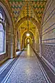 In mid-19th-century Manchester, many important Georgian buildings were blackened by atmospheric pollution. By the 1870s the local soft red Collyhurst sandstone was deemed to be unsuitable for public buildings, and tough Pennine sandstones were preferred.[22] The architectural competition entries were judged in part on their suitability for the "climate of the district", and sample stone types were investigated.[25] Waterhouse believed it was a matter of great difficulty to find a stone "proof against the evil influences of the peculiar climate of Manchester" but decided that the Bradford Dale-quarried Spinkwell Stone and Bolton Woods Stone/Gaisby Rock/Elland Flags stone would resist "the deleterious influences of Manchester atmosphere".[8][26][27][28][29] The interior decoration was chosen with a view to providing permanent colour and cleanable surfaces. Public corridors were faced with terracotta rather than plaster, and extensive use was made of stone vaulted ceilings, tiled dados and washable mosaic floors.[30]