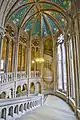 Waterhouse's plan for the town hall bridged the gap between office and ceremonial requirements and maximised space on its triangular site.[42] His design for a six-storey building filled the asymmetrical site.[43] Set around its perimeter is a cloister of corridors linking offices and everyday workings. Its grandiose, ceremonial features are centrally located. By the main entrance on Albert Square are two grand staircases leading to the landing outside its Great Hall. The stairs have low risers allowing access for women in Victorian dress. The walls of the staircases have tall, arched windows admitting daylight.[44] Three spiral staircases accessing the first floor from entrances on Princess Street, Lloyd Street and Cooper Street are constructed in English, Scottish and Irish granite.[45]