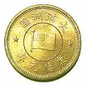 | 1 chiao (10 fen) | 22 mm | 1 mm | 1 gram | Aluminum | Plain/Smooth | Numerical "10"; text "• 國帝洲滿 • 年十德康" | Floral cartouche dividing the denomination; clouds above and below | 1943 (Kangde 10) | |