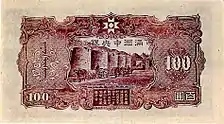100 yuan | Blue and yellow-orange | Flag of Manchukuo; building | Denomination | 1933 |