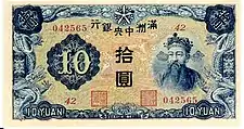 10 yuan | Blue and orange | Flag of Manchukuo; building | Denomination | 1932 |