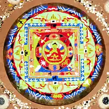 Sand mandalas are colorful mandalas made from sand that are ritualistically destroyed. They originated in India in the 8th-12th century but is now practiced in Tibetan Buddhism.[24] Each mandala is dedicated to specific deities. In Buddhism Deities represent states of the mind to be obtained on the path to enlightenment, the mandala itself is representative of the deities palace which also represents the mind of the deity.[24] Each mandala is a pictorial representation of a tantra. for the process of making Sand mandalas they are created by monks that have trained for 3-5 years in a monastery.[25] These sand mandalas are made to be destroyed to symbolize the Buddhist belief that death is not the end, our essence will return to the elements. It is also related to the belief of not becoming attached to anything.[26] To create these mandalas first the monks create a sketch,[27] they then take colorful sand traditionally made from powdered stones and gems into copper funnels called Cornetts[25] and start to gently shake them to make a pattern. Each color represents attributes of deities. While making the mandalas the monks will pray and meditate, each grain of sand represents a blessing .[28] Monks will travel to demonstrate this art form to people, often in museums.